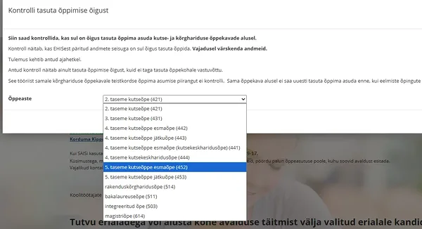 Kui sa pole kindel, kas saad tasuta kutseõppes õppida, siis saad seda kontrollida SAISis. Kontrolli õppeastet 5. taseme kutseõppe esmaõpe.